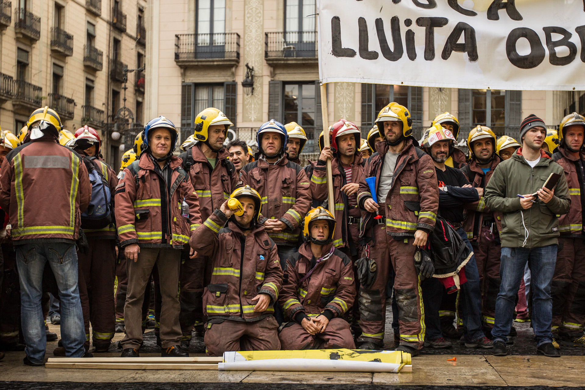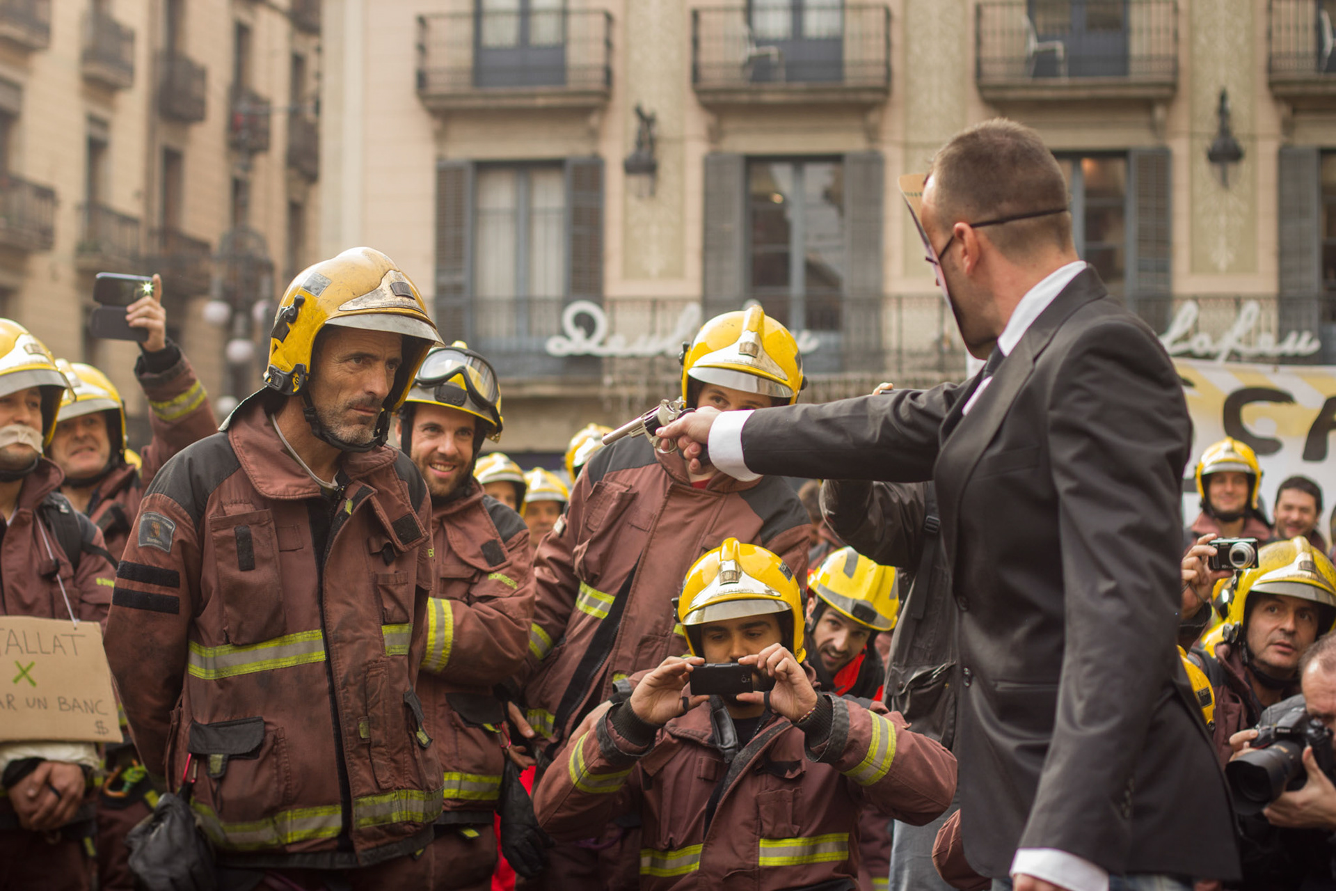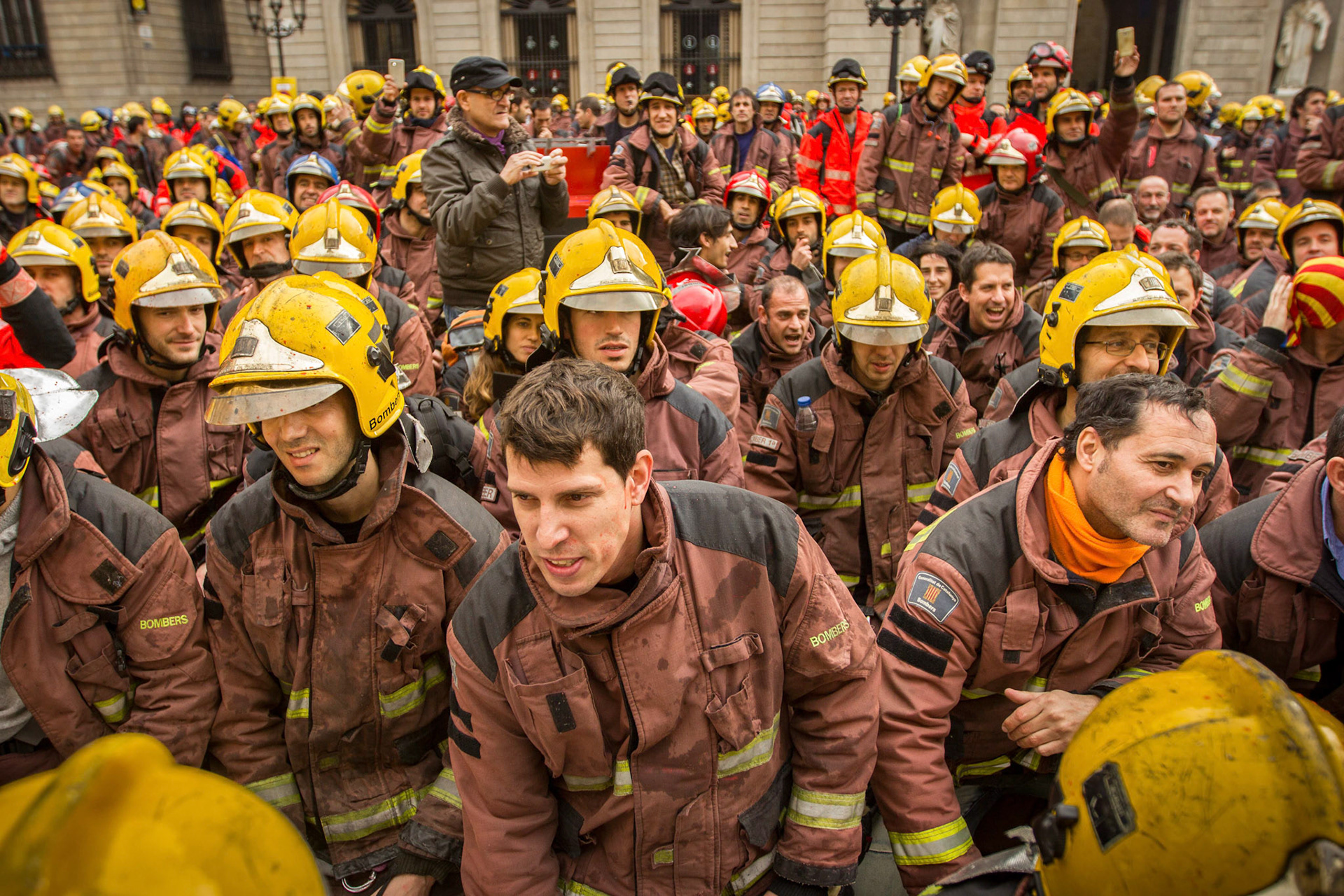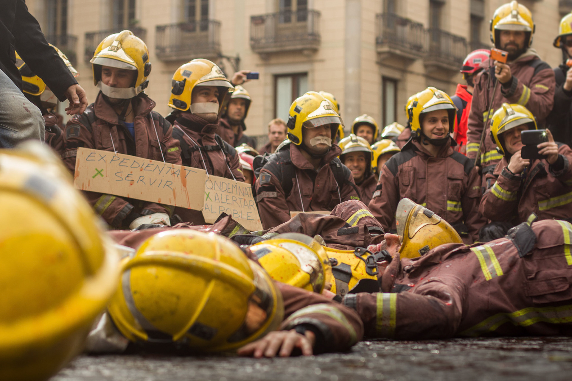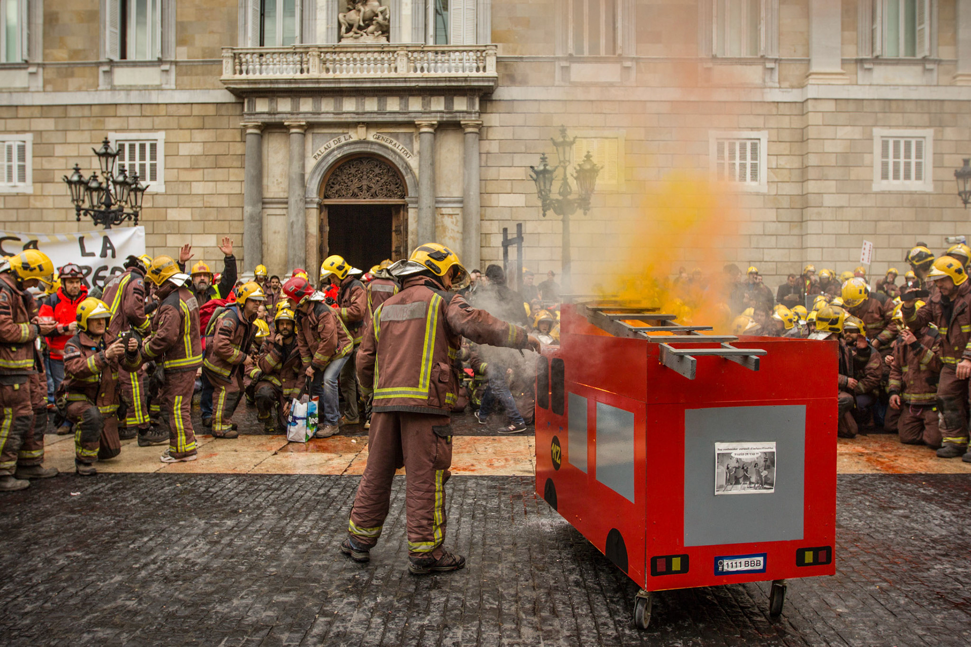 Barcelona, January 16, 2014 , a thousand professional body Firefighters of the Generalitat de Catalunya , concentrated on a demonstration outside the Parliament , through the Generalitat in Plaça Sant Jaume in Barcelona. Vindicated best working conditions, demonstrating peacefully against economic austerity policy of the Government. Denounced the lack of interest and absolute irresponsibility by the Generalitat . Fire services mock executions and finished the event with a reading of the manifest it delivered to the door of the Genelaritat .