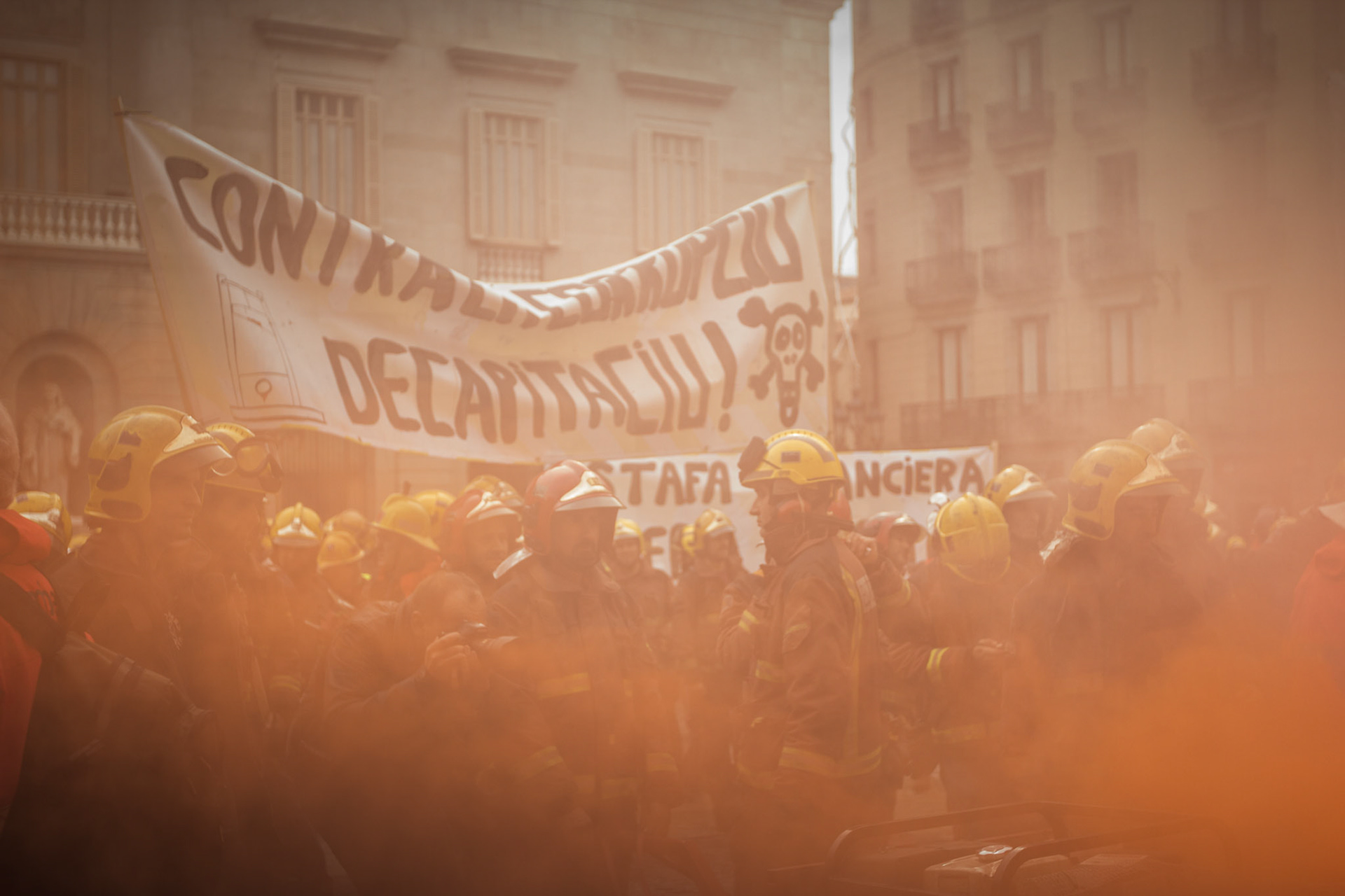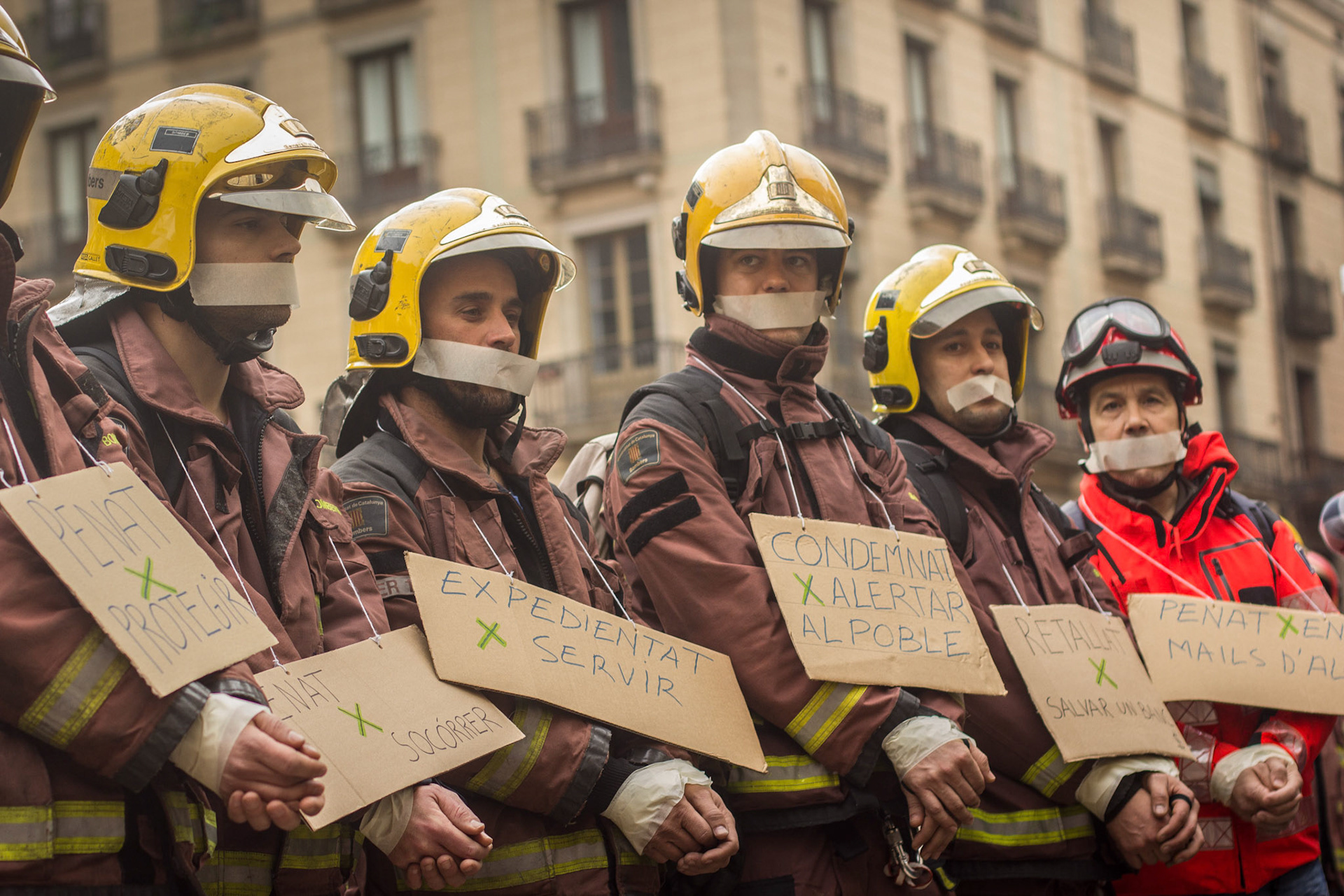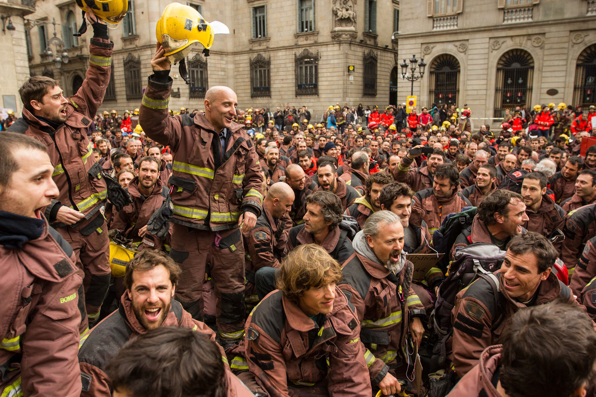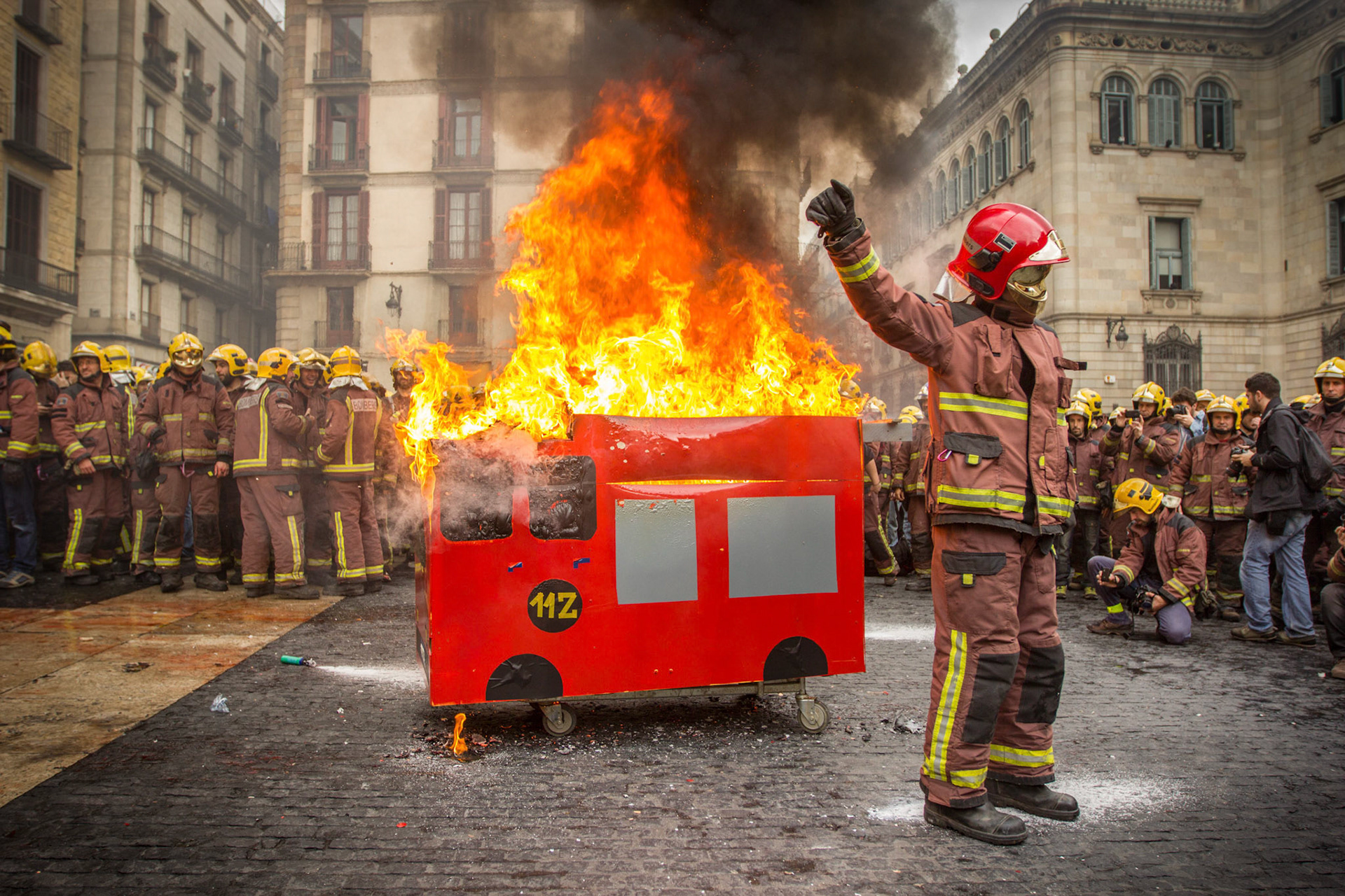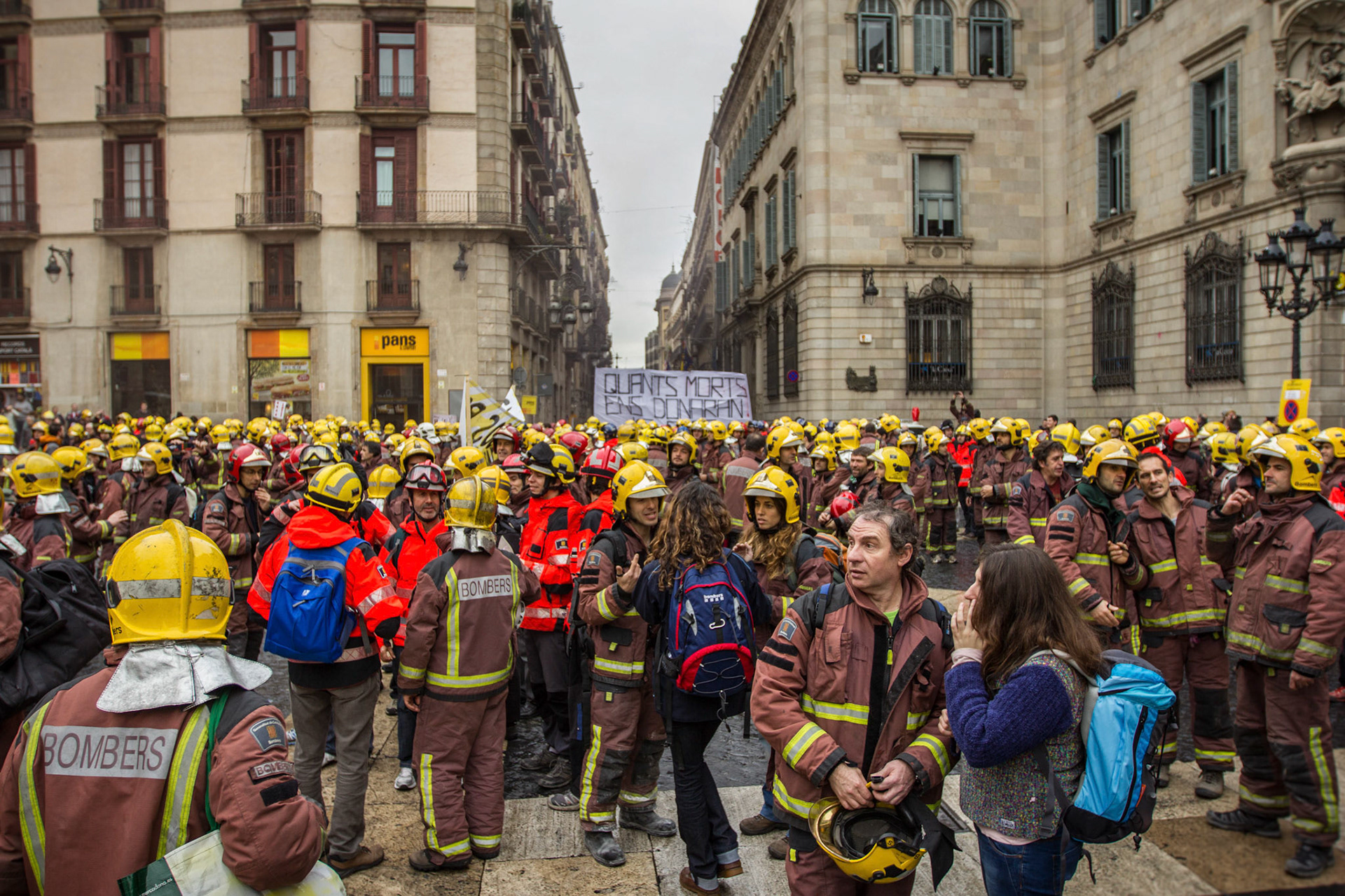 Barcelona, January 16, 2014 , a thousand professional body Firefighters of the Generalitat de Catalunya , concentrated on a demonstration outside the Parliament , through the Generalitat in Plaça Sant Jaume in Barcelona. Vindicated best working conditions, demonstrating peacefully against economic austerity policy of the Government. Denounced the lack of interest and absolute irresponsibility by the Generalitat . Fire services mock executions and finished the event with a reading of the manifest it delivered to the door of the Genelaritat .